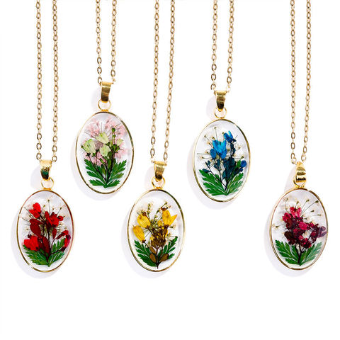 Colliers de fleurs pressées séchées ovales naturelles Colliers de fleurs véritables Bijoux en résine Collier en acier inoxydable fait à la main pour femmes
